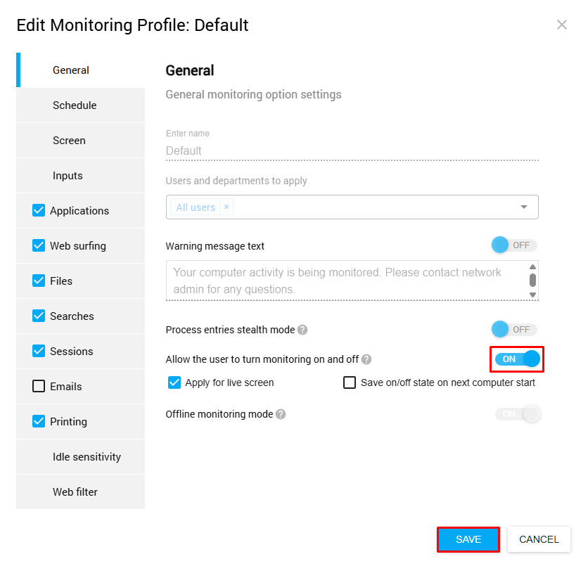 - Toggle "Allow the user to turn monitoring on and off" to switch between Icon and Stealth modes.