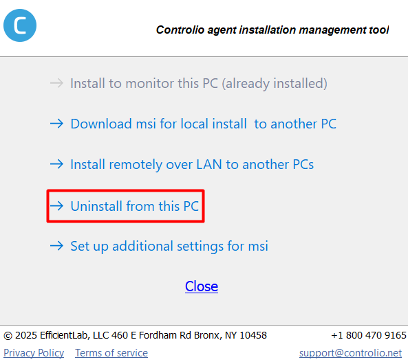 To uninstall the Controlio Client from your PC without being connected to the Controlio Dashboard, please follow these steps: