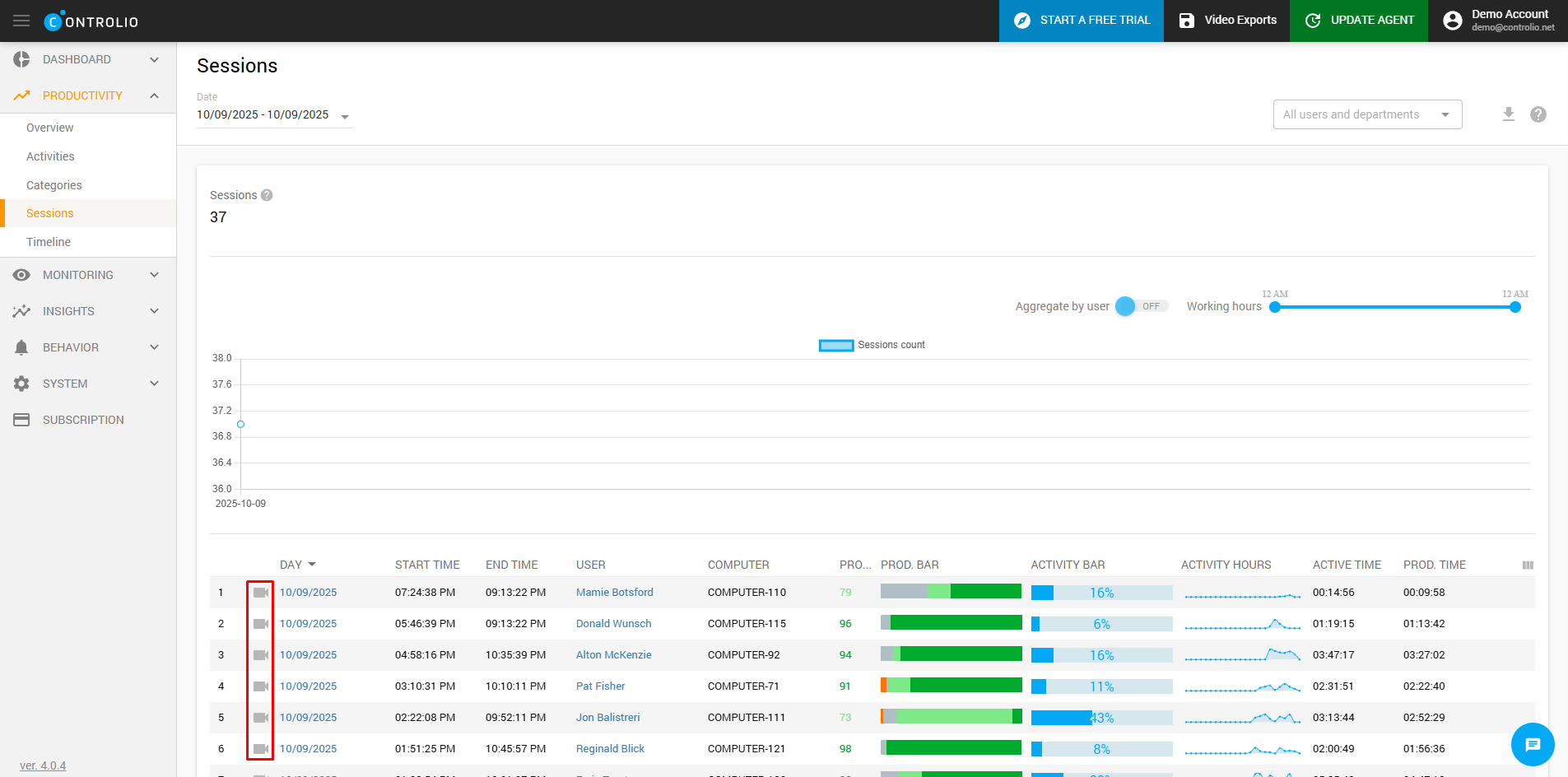 Controlio provides you with the ability to watch video recordings that are connected to different monitoring reports. When you click on the camera icon of a specific report, the video player that shows up will have the entire video recording of the day; but it starts playing from the time-stamp that is linked to the chosen report item.