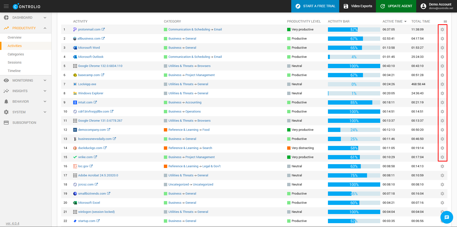 The productivity level of an activity, or of an entire category is initially preset by Controlio.