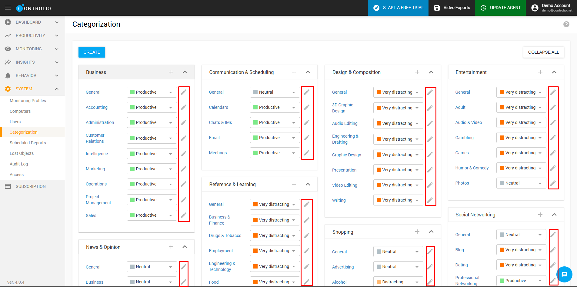 - Navigate to PRODUCTIVITY - Categories on the left side of the Dashboard.