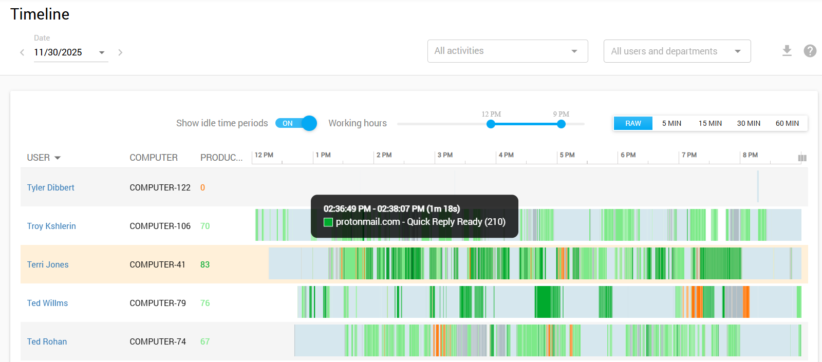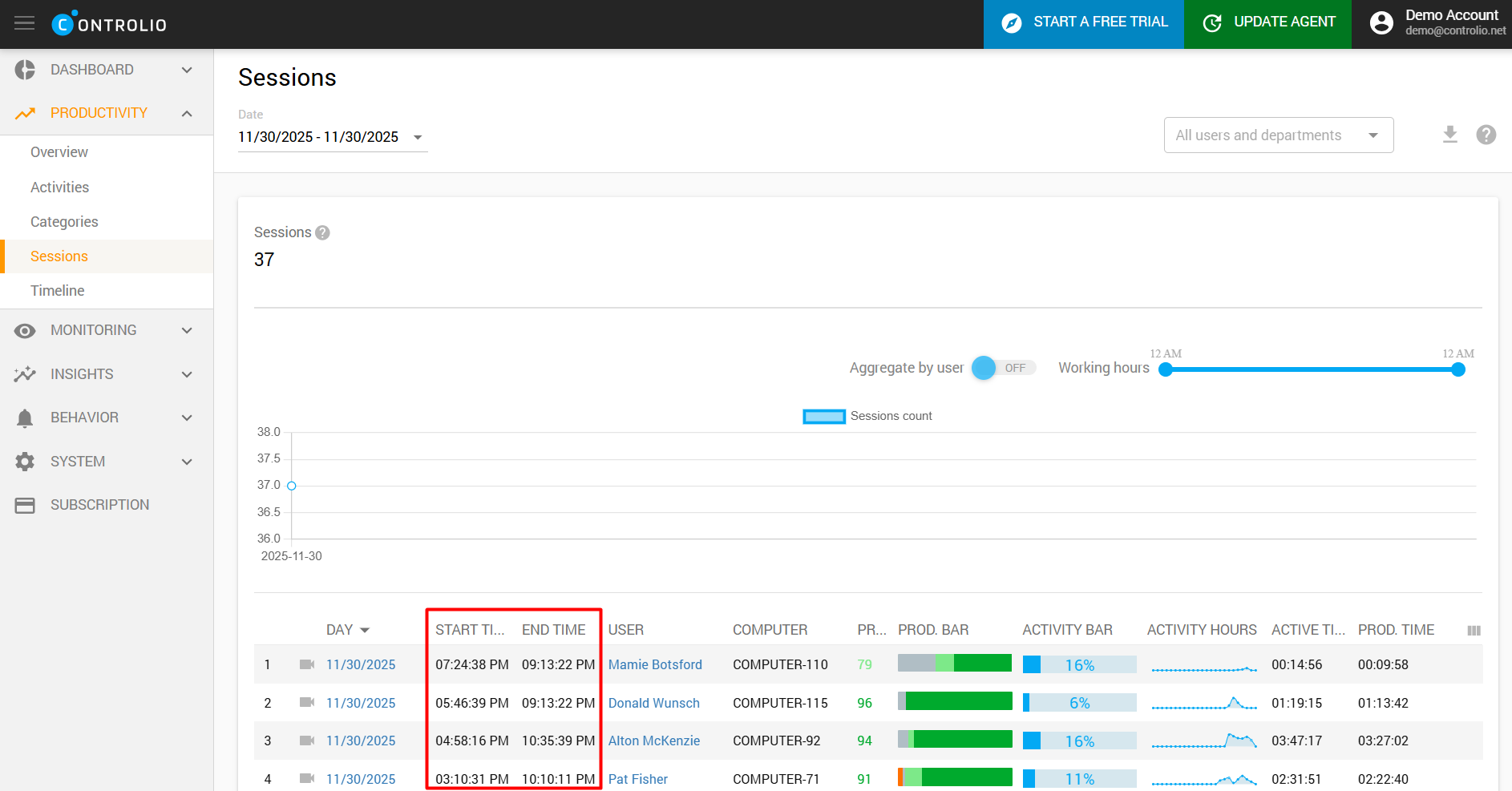 - The Sessions report indicates the first and last activity per day, giving you an idea of when employees start/end their shifts.